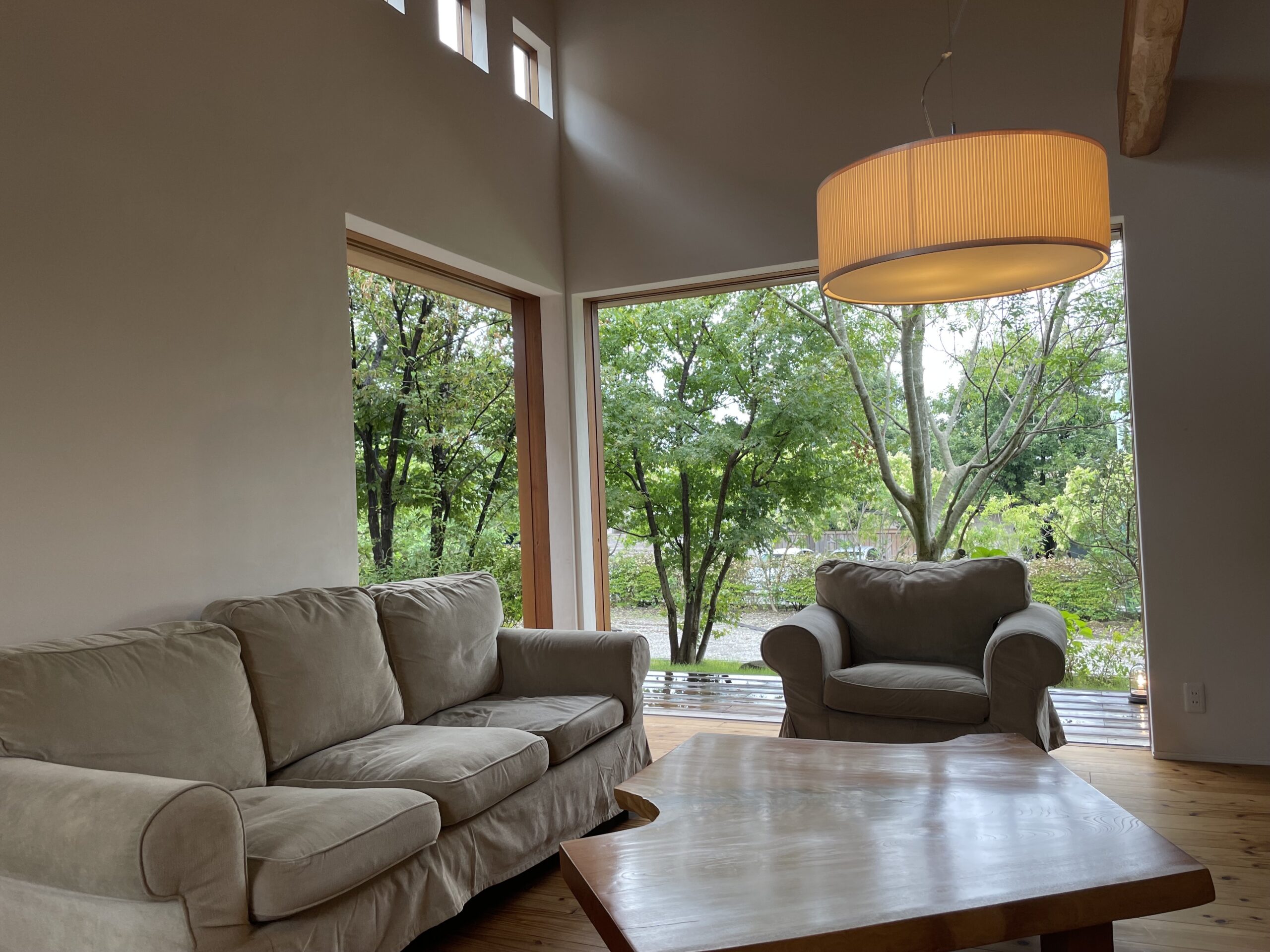 まるで林の中に立っているようなその家は、柱も床も壁も触れるところすべてが自然素材。